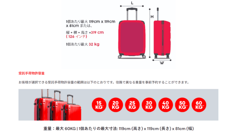 受託手荷物有料20kg 含まれる20kg 含まれる40kg 含まれる