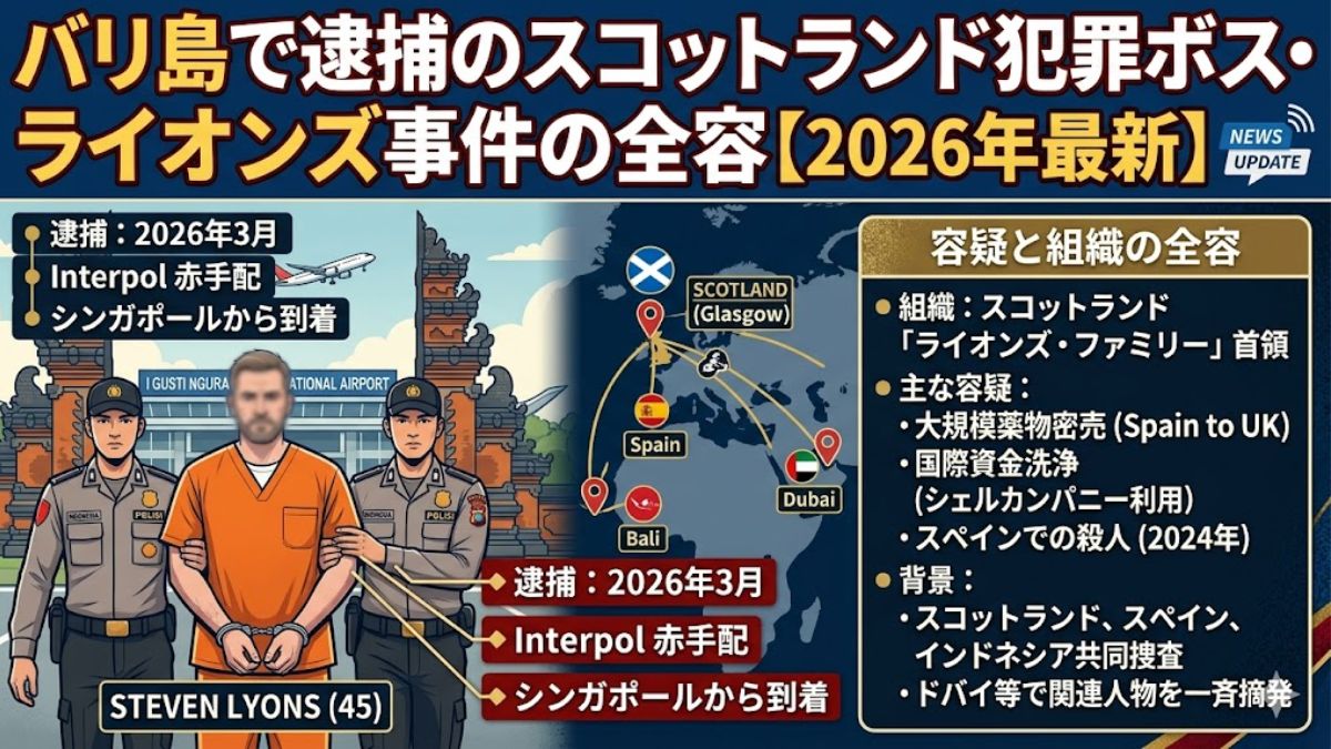 2026年3月28日、バリ島のングラライ国際空港でスコットランドの国際犯罪組織ボスとされるスティーブン・ライオンズ(45歳)が逮捕されました。インターポールの国際手配(レッドノーティス)を受けたインドネシア入国管理局が空港で身柄を拘束。4月8日にはアムステルダムへ強制送還され、スペインへの引き渡しが進められています。