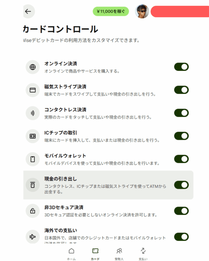 決済やATM引き出しもON/OFF切り替えられるから安心。